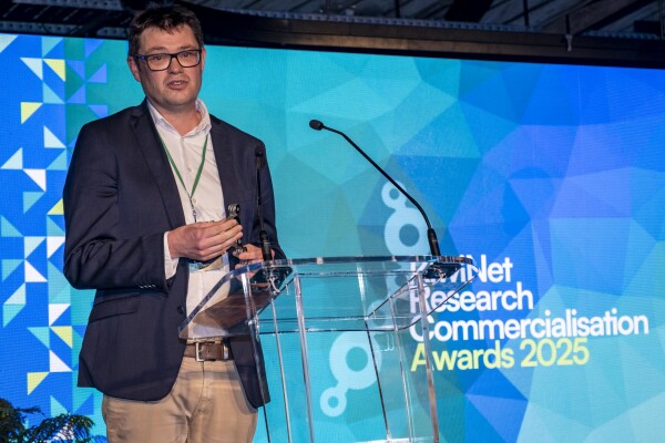 Two of our researchers took home KiwiNet awards last night — Dr Ben Mallett won the Ara Ake Breakthrough Innovator Award and Professor Aaron Marshall the BNZ Researcher Entrepreneur Award at the 2025 KiwiNet Research Commercialisation Awards.